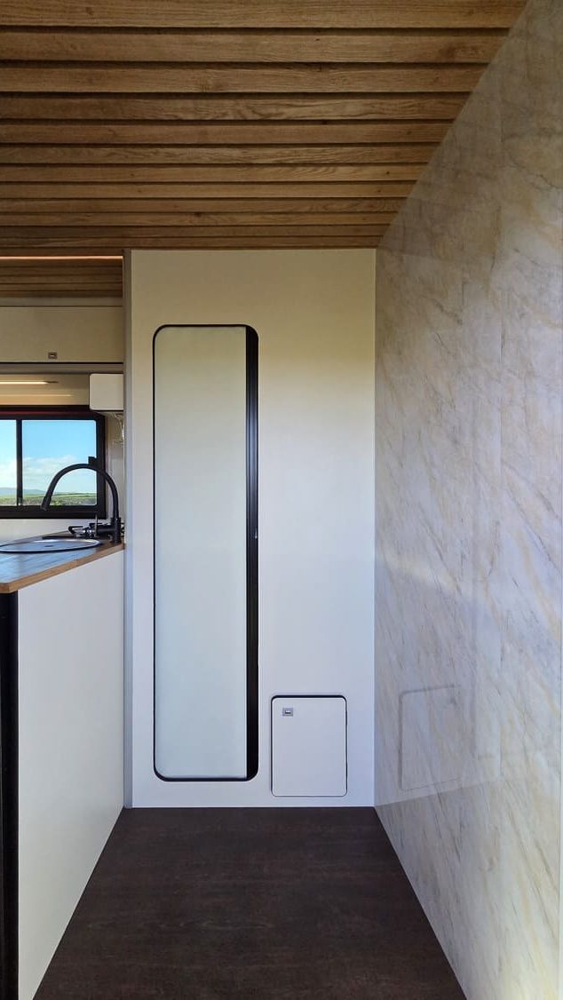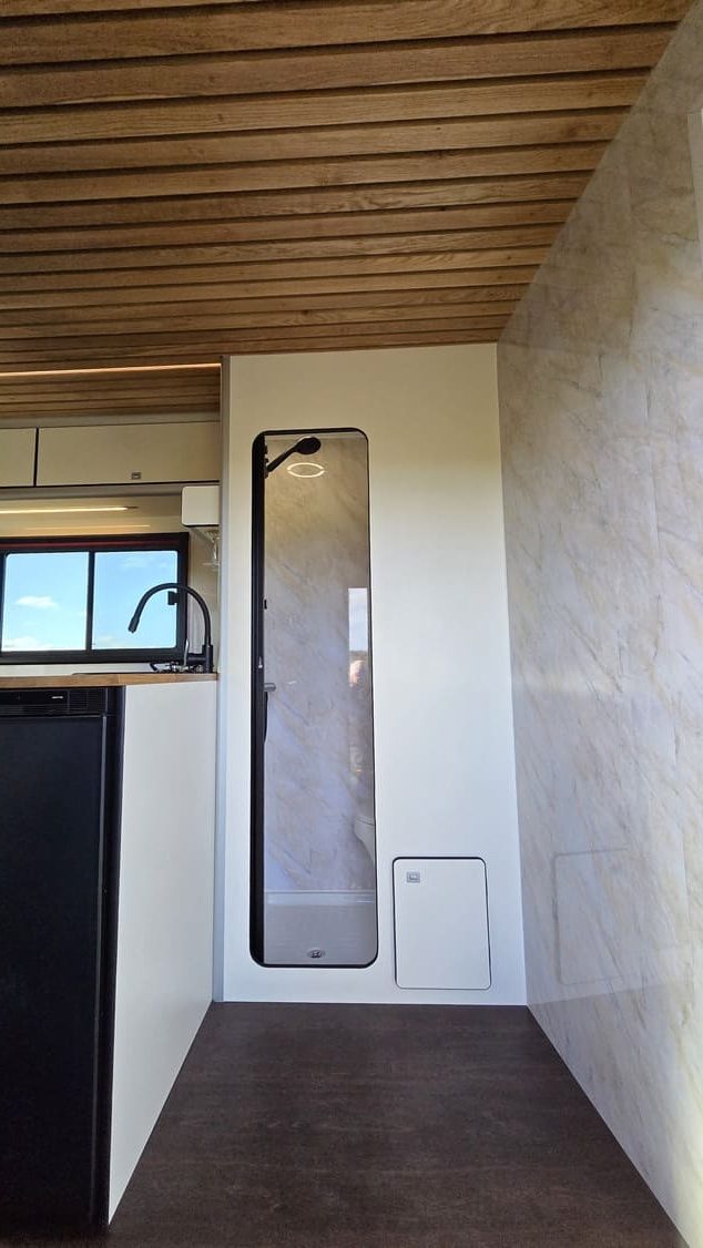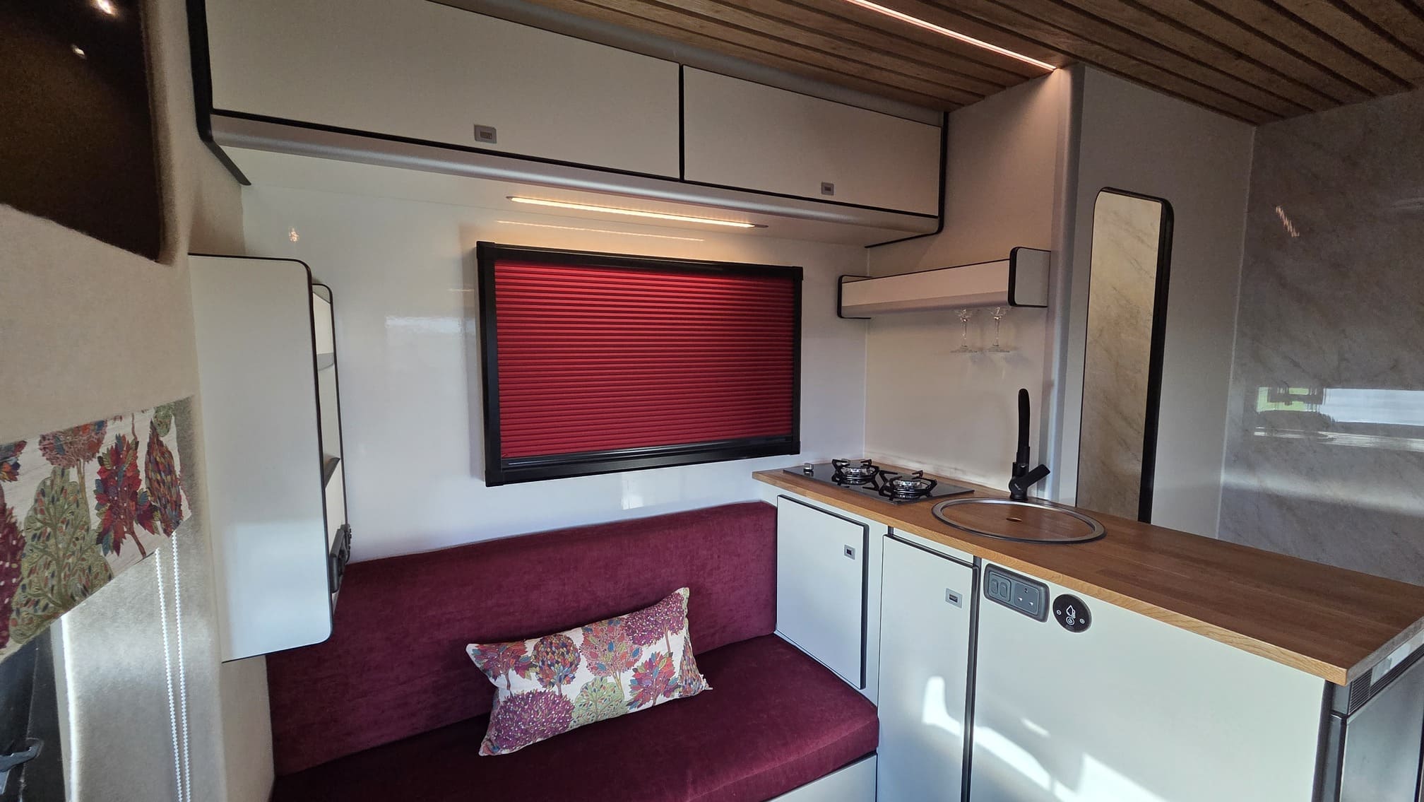 Powering this cosy home on wheels is a leisure battery system, Victron charging system, solar power, & 240-volt hookup, ensuring complete off grid capability & peace of mind.