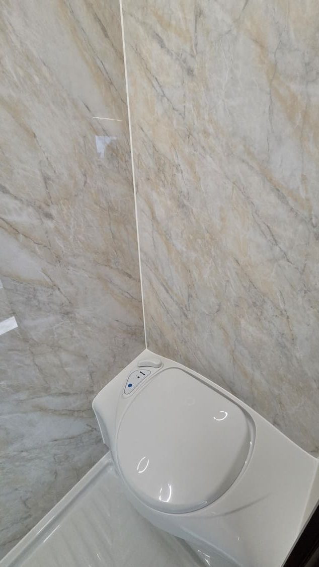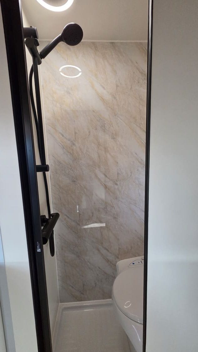 The layout also includes a dedicated shower & toilet area, finished with marble shower panels, a modern lightweight waterproof door, & a Maxxair dome light & fan. Complemented by contemporary fittings, this space offers both privacy & convenience on the road including the luxury of a hot shower wherever the journey takes them.