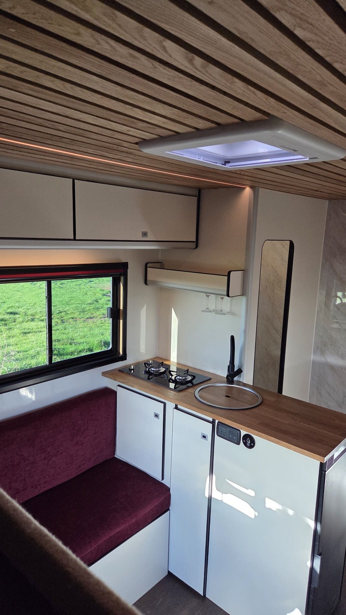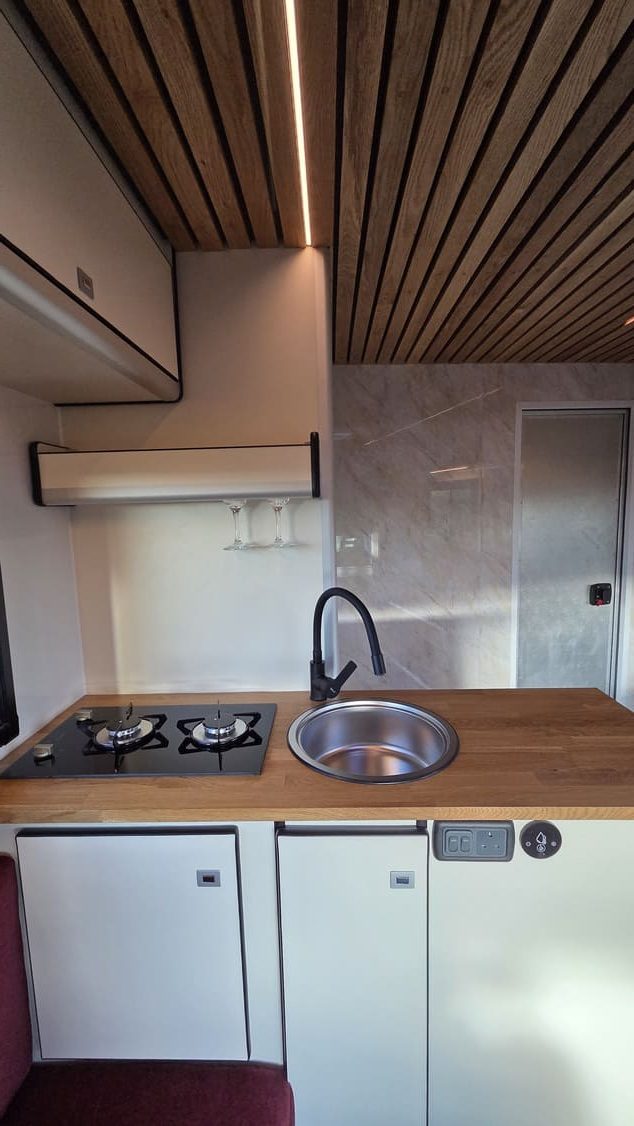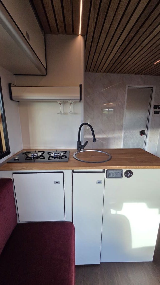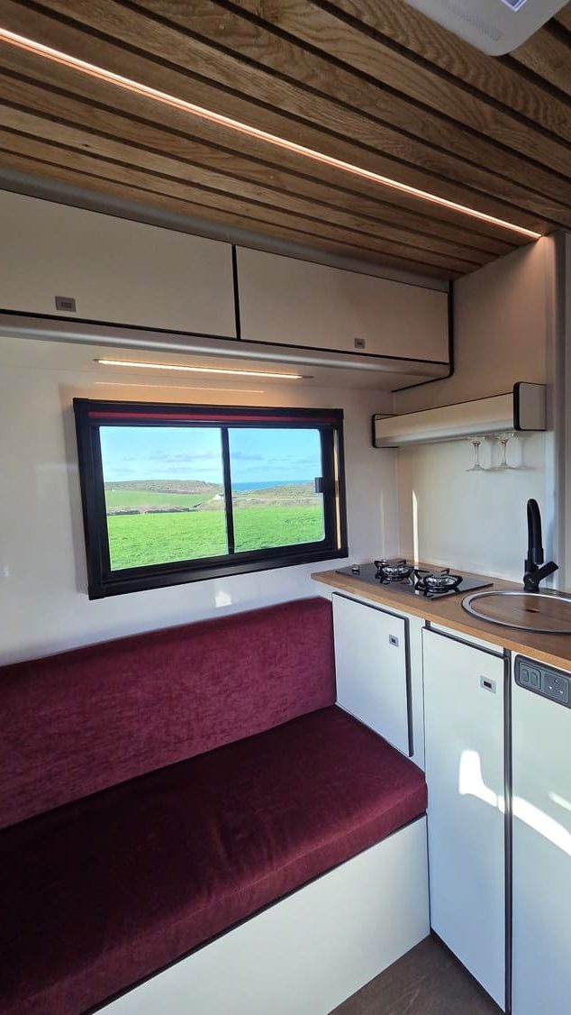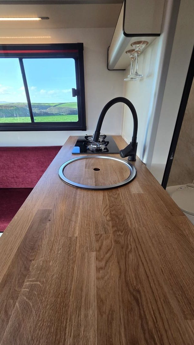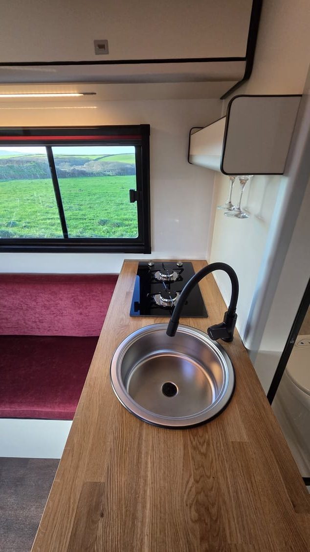 The kitchen has been thoughtfully designed to maximise usability without compromising on style. It features a solid oak worktop, sleek black mixer tap, integrated sink, two burner gas hob, 90 litre fridge, generous storage, an overhead shelf for essentials, & integrated housing for wine glasses. A 240-volt socket is also included for additional appliances.