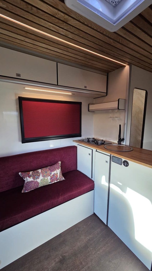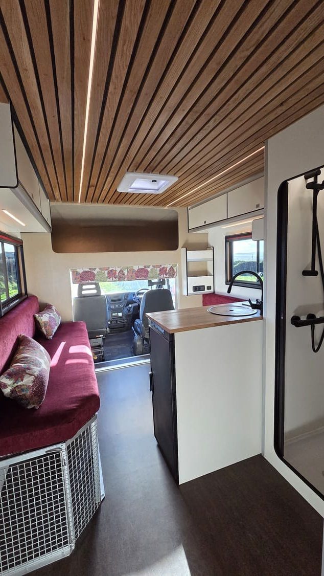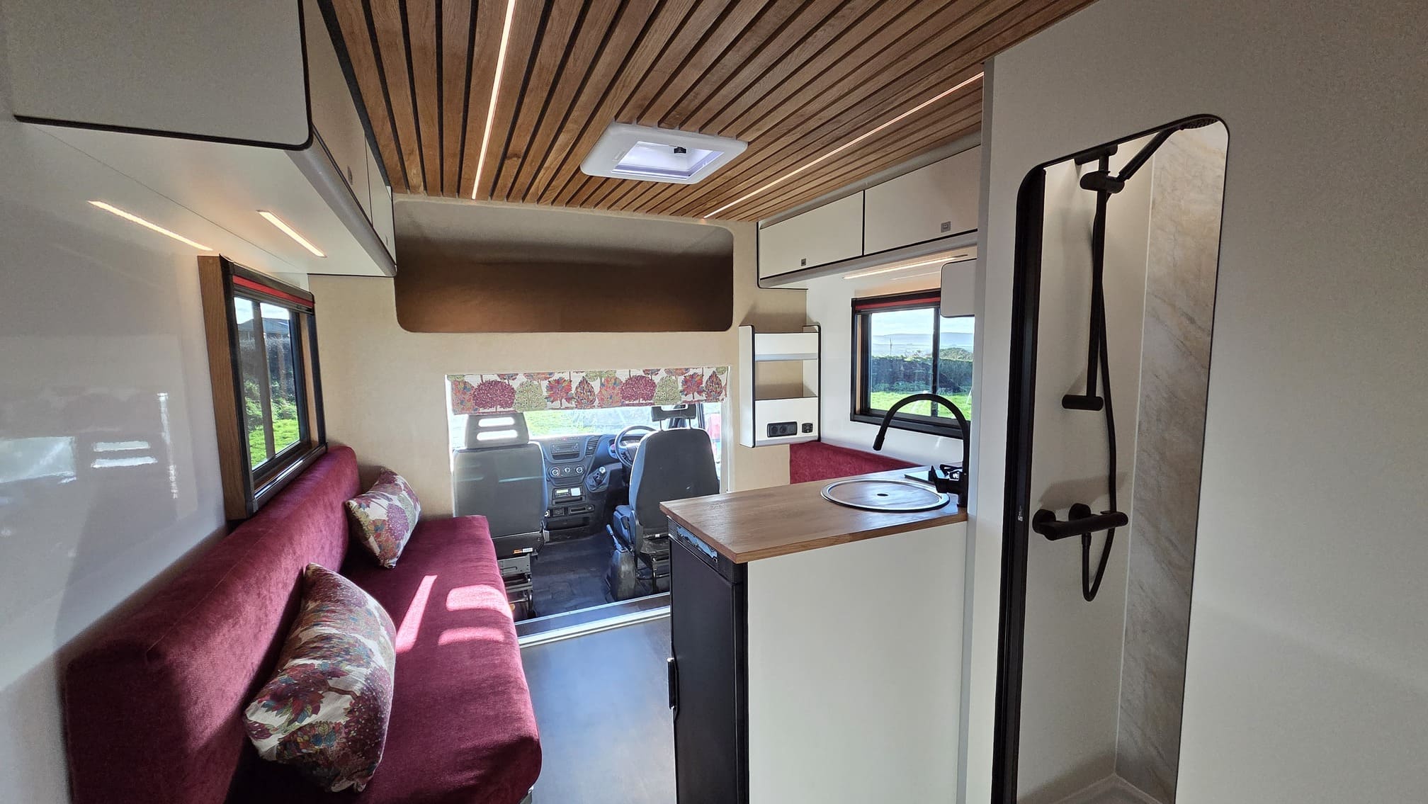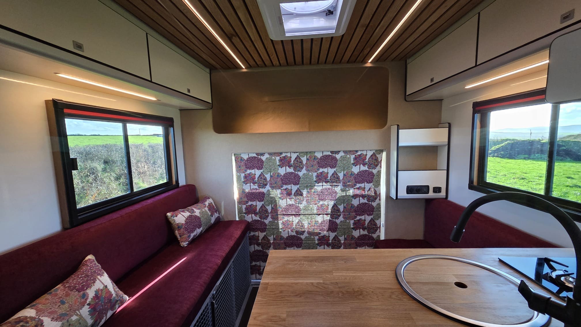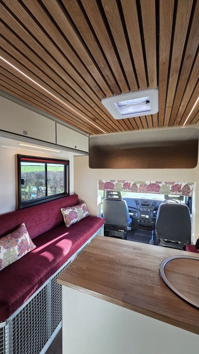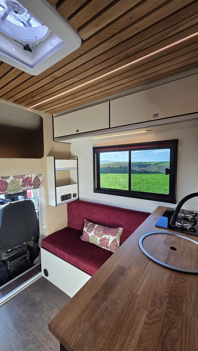The living area is defined by a striking slatted oak ceiling, beautifully complemented by integrated dimmable LED strip lighting running the full length of the van, creating a warm & ambient atmosphere both day & night.